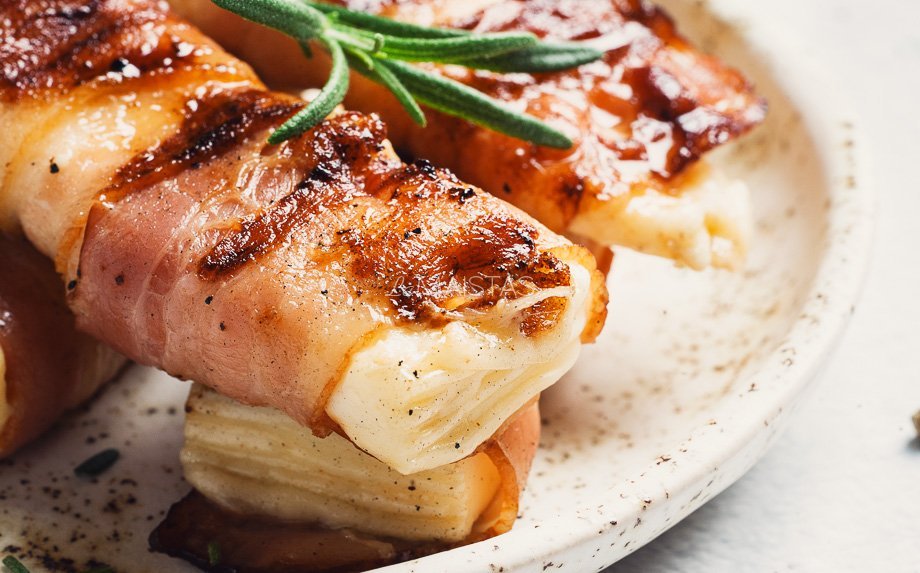 2. Kiekvieną sūrio gabalėlį suvyniokite į šoninės riekelę