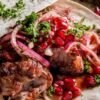 4. Sprandinės gabalėlius sumauti ant iešmų ir kepti ant grilio, vis pavartant, kol šašlykai bus gražiai apskrudę iš visų pusių.