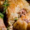 5. Įkaitintoje keptuvėje ištirpiname sviestą ir dedame patraiškytas bulvytes. Jas apkepiname, kol apskrus ir taps traškios. Pagardiname druska ir pipirais.